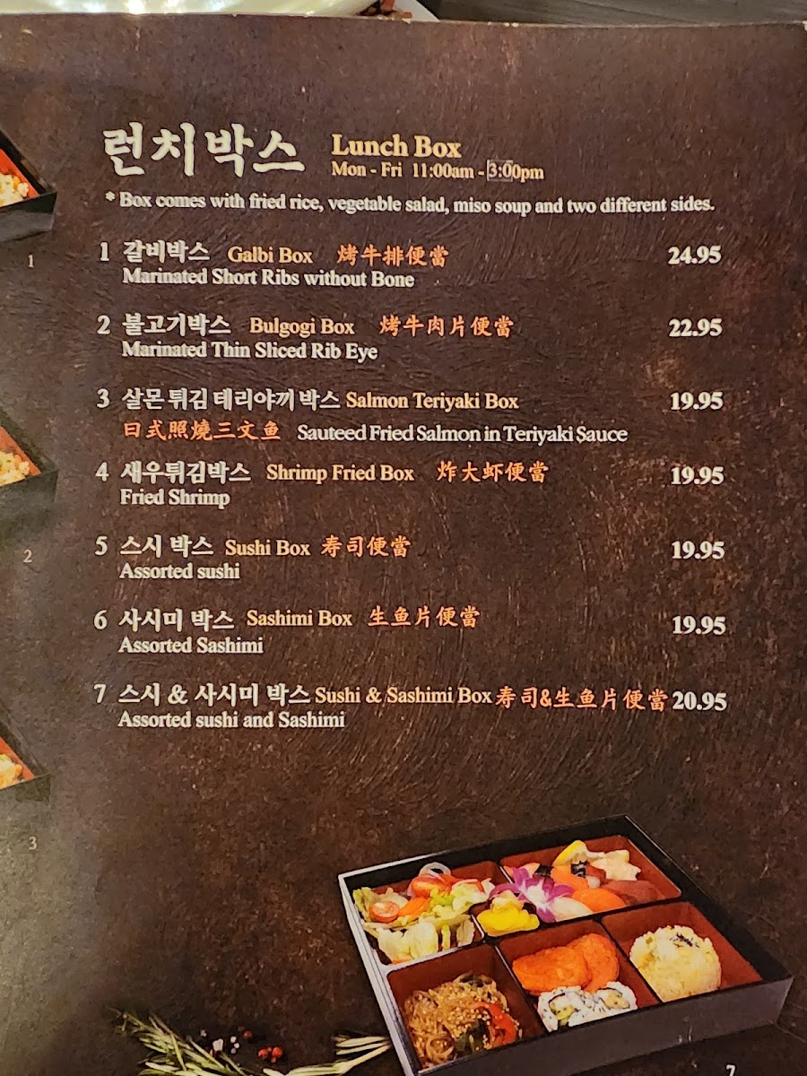“ A very large selection on their menu! Not only do they offer Korean barbecue, but sushi as well. The combo platter that we ordered is supposedly their most expensive - 4 different kinds of meat, a sushi platter, a bottle of red wine, a bottle of sparkling water, and soup. I don’t believe I left anything out. The food was delicious. The meat is cooked medium well and is very flavorful. The soup was delicious as well. Quite sweet, which I did not expect since we requested for the soup to be mildly spicy. We received a scallion pancake for free. The pancake was thick and went quite well with the soup if paired together. The service was phenomenal although they were short staffed. Our waitress went above and beyond for our table. She even cut up the meat in bite-size portions for my children, and she set it aside for me. My advice is if you’re going to order combo platters, I would probably skimp out on those small dishes (I forget the proper name for them) because it was a lot of food and for a party of 7, we were sadly unable to finish our food. I would most definitely come here again to celebrate a birthday, or with a large group if you don’t want the food to go to waste. ”